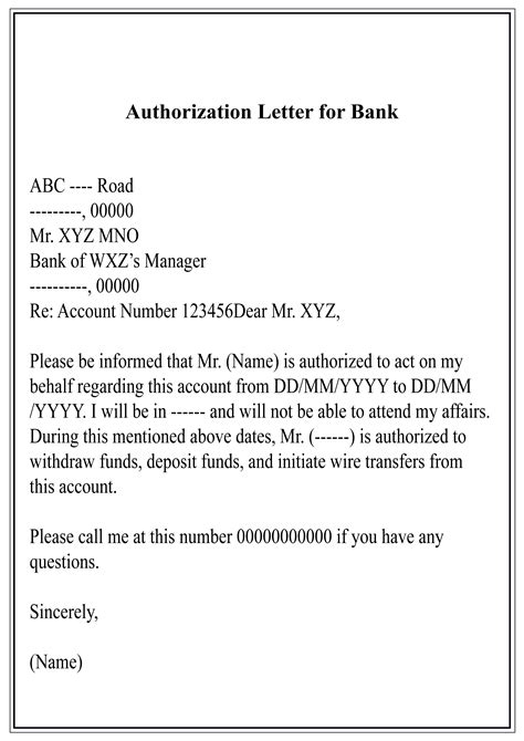 authorization letter for bank account document sample